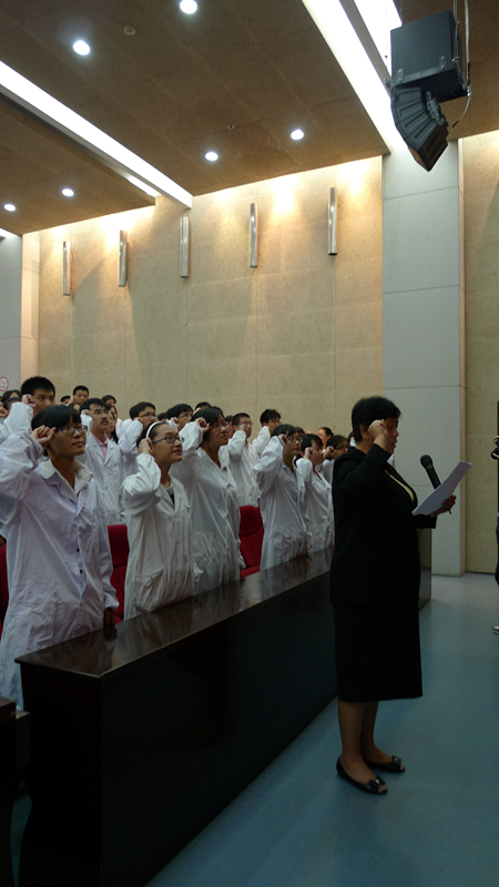 医学生宣誓仪式由张小玲副书记领誓。身着白大褂的全体2009级医学生庄严宣誓,“立志除人类之病痛,助健康之完美,为祖国医药卫生事业和人类身心健康,奋斗终生”。随后滕鹏同学代表学生发言,他表示必将秉承承诺,孜孜以学,精益求精。