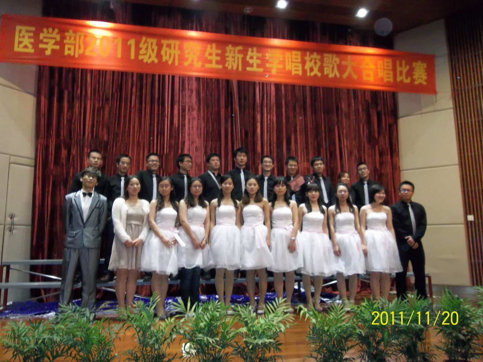 大不自多,海纳江河,白衣放歌、求是传情,树我邦国,天下来同! 20111120日晚,由浙江大学医学部主办,医学部研博会承办的2011级研究生新生学唱校歌合唱比赛在华家池校区教学楼小礼堂隆重拉开帷幕。医学部党委副书记张小玲,研工部研究生事务管理办公室副主任王莉,华家池学生管理中心主任汪苏华,医学部团委副书记李智巧、王黎芳老师担任比赛评委。浙医二院陈唯唯老师、基础系林海燕老师也到场观看了比赛。
