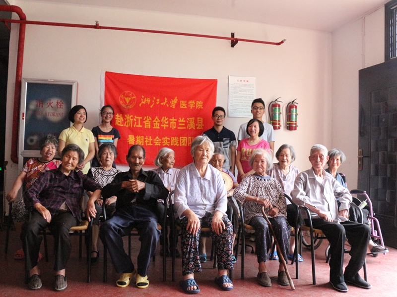 与前一天在塘上村以及塘下村给老人量血压所得情况相比,这里的老人血压普遍较为正常,这让我们一行人感到非常安心。在按摩方面,同学们仔细地询问老人们哪里有酸痛感,从而有重点地进行按摩。介于有些老人的身板较为瘦弱,同学们在按摩的时候都会注意轻重,尽量不让老人感到不舒服。按摩过程中,也有颐养中心里的陪护人员和同学们探讨怎样给老人更好地按摩,大家相互交流着,气氛轻松而愉悦。按摩其实挺累人的,又在高温天气下,不多时,同学们穿在白大褂里的T恤就被汗水沾湿了。有同学额头上的汗水也不小心滴到老人身上,正尴尬着,老人们也看出了同学们的辛苦,用温润的方言叮嘱我们可以慢慢来,不要太累,还有一位腿脚不便的老奶奶一直想要给我们搬椅子让我们休息一会儿,这些让我们在异乡金华兰溪感受到了浓浓的长辈关怀。对于我们尚未能回答出老人的部分问题,老人们还鼓励我们要学习得更好,我们倍受鼓舞。量完血压和按摩后,我们和老人们聊起家常,虽然语言不是很通,但我们还是很顺利地聊了下来,因为大家都是用心在沟通。当然,因为方言不是很懂,我们经常会错意,还闹出了不少笑话,逗得老人们呵呵大笑.