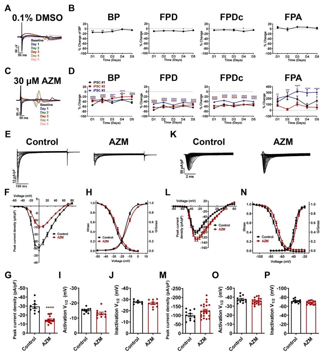 首先,作者应用诱导多能干细胞衍生的心肌细胞(iPSC-CM)模型进行了阿奇霉素急性给药的电生理研究。微电极阵列实验显示:低浓度阿奇霉素对iPSC-CMs的场电位(field potential,FP)无显著影响;而高浓度阿奇霉素作用下,iPSC-CMs的心率显著加快,场电位时程(FPD)显著缩短。作者进一步应用单细胞膜片钳评价阿奇霉素对不同离子电流的影响,发现了高浓度阿奇霉素能够显著抑制钠通道和钙通道电流,而对于钾通道特别是以往认为的潜在作用靶点hERG钾通道几乎没有影响。