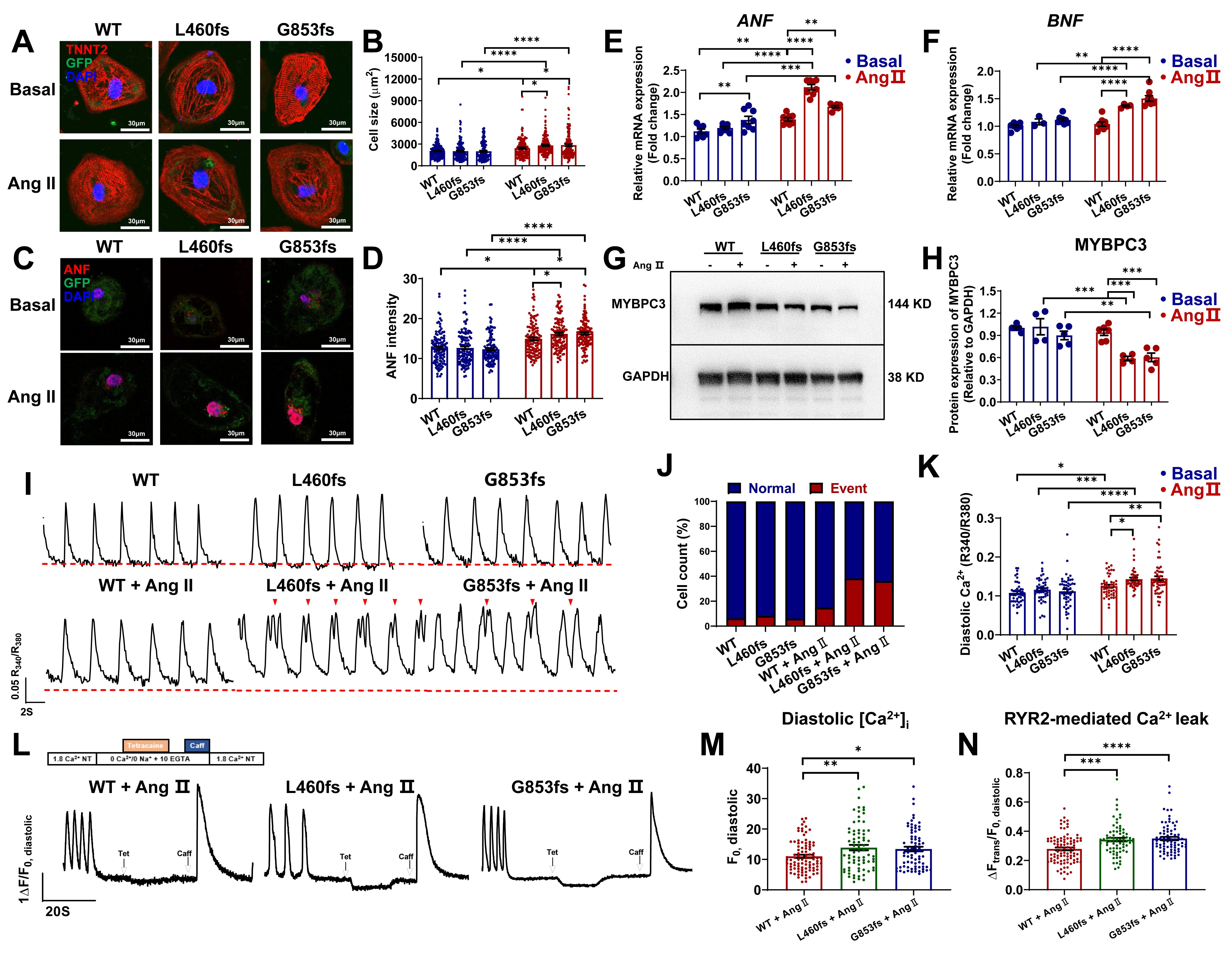 研究者对健康志愿者皮肤活检后进行成纤维细胞的培养和扩增,并应用非整合型仙台病毒进行体细胞重编程建立诱导多能干细胞(iPSCs),并应用心肌定向分化技术获得iPSC衍生的心肌细胞(iPSC-CMs)。后续,研究者构建了携带有与病人相同点突变的MYBPC3质粒。通过慢病毒过表达的方法在正常人iPSC-CMs中导入了野生型(WT)和突变型(MUT)的人源MYBPC3质粒。在免疫荧光、qPCR、Western blot和钙成像等实验中发现:在血管紧张素IIangiotensin II, Ang II)诱导下,与野生组相比,突变组心肌细胞表现出细胞面积增大、肥大标志物表达上升、MYBPC3蛋白水平下降、心律失常以及细胞内钙超载(Ca2+ overload)等HCM的细胞表型。进一步的丁卡因实验发现:兰尼碱受体2RYR2)介导的钙漏(RYR2-mediated Ca2+ leak)增加导致了突变组心肌细胞内的钙超载。